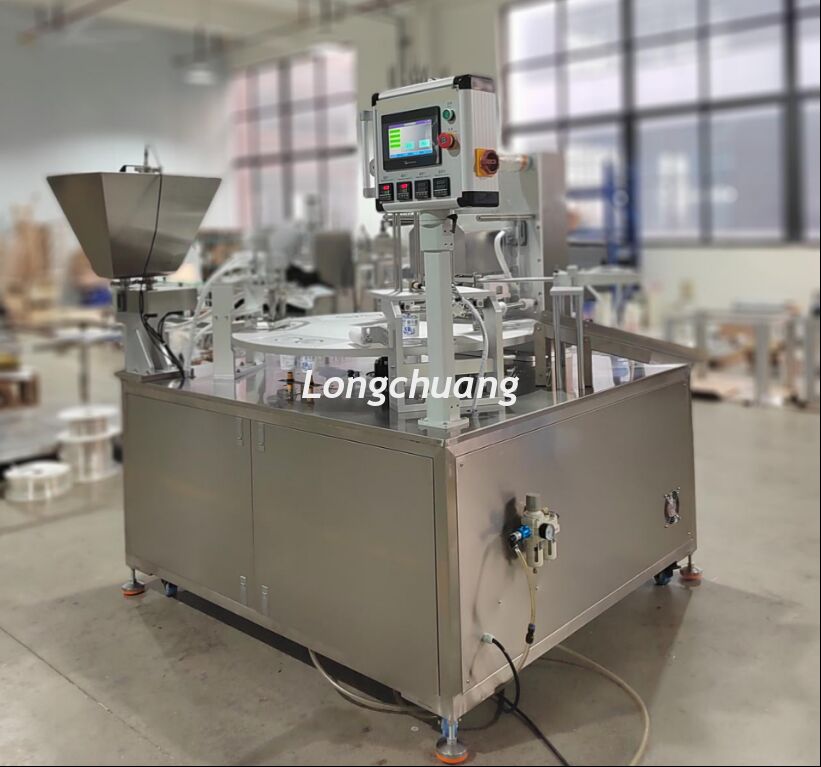 2. 생산 속도: 1구 2구: 1000-1200 컵/시간. 작업 흐름: 자동 컵 낙하, 자동 재료 충진 (잠수 충진), 저장 호퍼 포함; 호퍼가 비어 있을 때 자동 재료 보충 (선택 사항), 자동 열 실링, 자동 컵 배출.